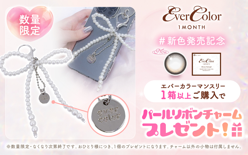 対象の店舗にて『エバーカラーマンスリー』を1箱以上お買い求め頂いたお客様に、先着でオリジナルの「パールリボンチャーム」をプレゼントいたします。